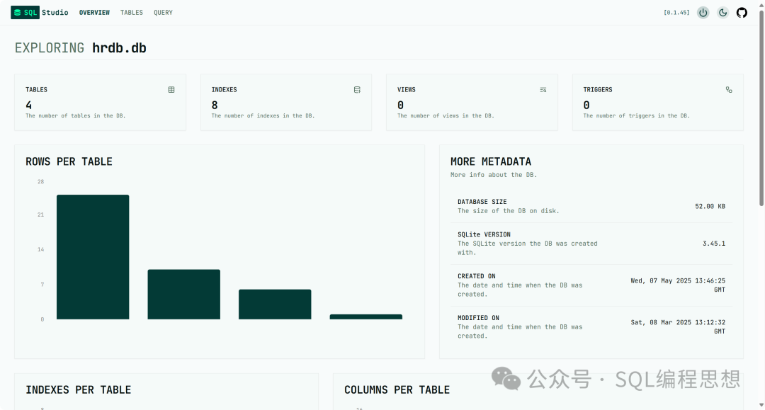 SQLStudio是一个免费开源、基于Web浏览器的轻量级数据库查询工具。SQLStudio主要采用Rust、TypeScript语言开发,遵循MIT开源协议,代码托管在GitHub:https://github.com/frectonz/sql-studio功能特性•跨平台:SQLStudio支持Windows、ma...
