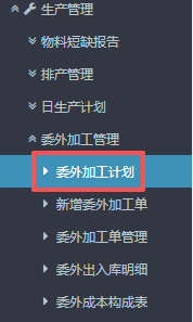 点晴ERP-委外加工单管理流程 进入ERP系统之后,在左侧的功能菜单里找到“生产管理”,点开“委外加工管理”,点击“委外加工单管理”。 2.进入页面后,按图操作:选好委外单类型、物料类型以及单据状态,然后点击查询。在下方得到当前确认的加工单信息。 ​