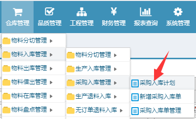 进入ERP系统,在左侧或者是上方菜单栏上找到”仓库管理“》”物料入库管理“》”采购入库管理“》”采购入库计划“