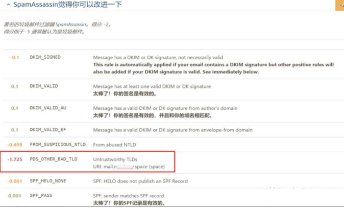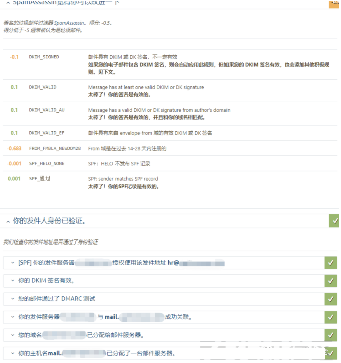 根据以下内容设置完后邮件可信度测试如下所示,其中扣分的地方是我购买的域名还没超过28天。