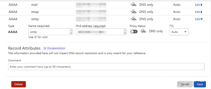 将 mail.mydomain.com 的 AAAA 记录指向你的 VPS 服务器(邮件服务器)IPv6地址