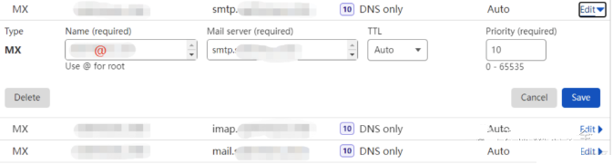 MX 记录就是邮件的解析记录,非常重要的一条记录,配置根域名的 MX 记录为自己的邮件域名地址,优先级为 10