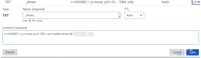 添加方法就是增加一条 _dmarc 的 TXT 解析,内容为配置选项,