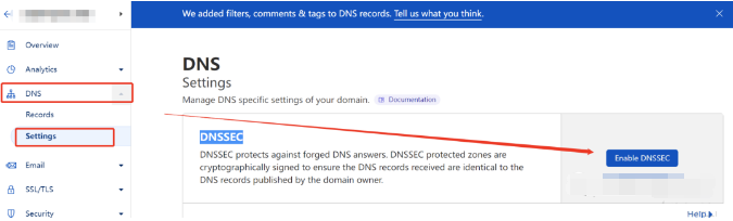 这里我使用的是 CF,到域名管理控制台左侧栏找到 DNS 中的 Settings,进入 DNS 设置页面启用 DNSSEC。