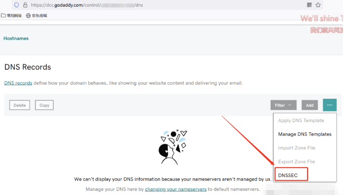 到你的域名注册商设置 DS 记录,我的域名注册商是Godaddy 到域名DNS设置处找到 DNSSEC。