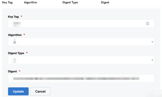 其中的 Key tag、Algorithm、Digest Type、Digest按照提供的数据填写后点击 update 即可。