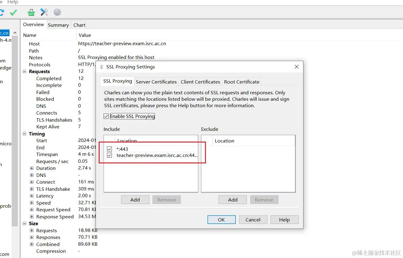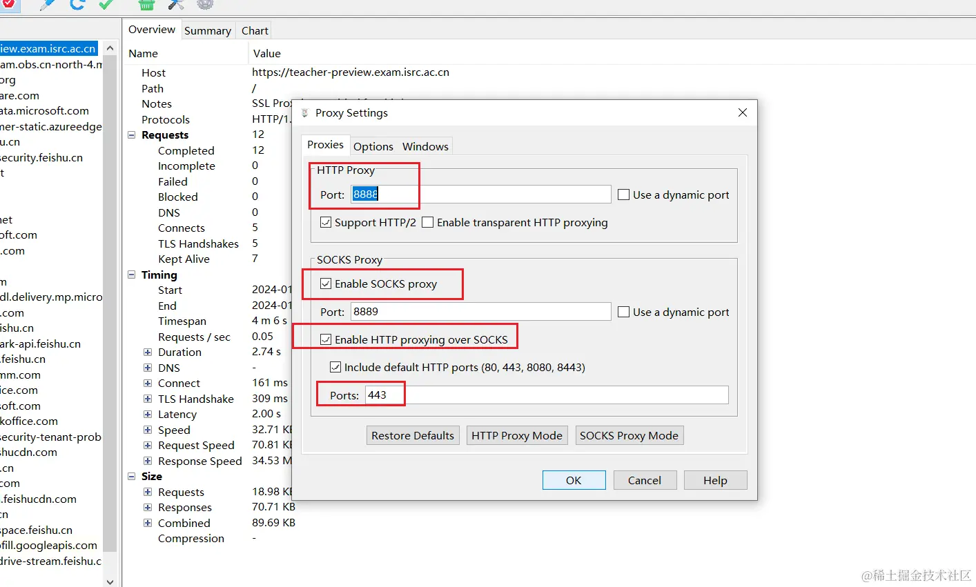 点击Proxy Settings,勾选Socks Proxy下的两个复选框,Enable HTTP proxying over SOCKS 勾选后允许Charles抓取HTTP请求,HTTPS配置443接口