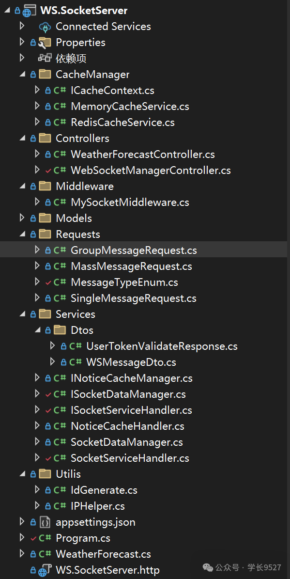# INoticeCacheManager.csnamespace WS.SocketServer;/// <summary>/// 消息缓存接口/// </summary>public interface INoticeCacheManager{    /// <summary>    /// 获取用户所有离线消息    /// </summary>    /// <param name="toUser">接收人</param>    /// <returns></returns>    List<objectGetUserAllHistoryNotices(string toUser);    /// <summary>    /// 缓存离线消息    /// </summary>    /// <param name="toUser">接收人</param>    /// <param name="message"></param>    void AddNotice(string toUser, object message);    /// <summary>    /// 缓存消息发送记录    /// </summary>    /// <param name="toUser">接收人</param>    /// <param name="message"></param>    void AddNoticeRecord(string toUser, object message);    /// <summary>    /// 删除缓存中的消息    /// </summary>    /// <param name="toUser">接收人</param>    void RemoveNotice(string toUser);}#NoticeCacheHandler.csnamespace WS.SocketServer;/// <summary>/// 缓存消息处理类/// </summary>public class NoticeCacheHandler : INoticeCacheManager{    private readonly ICacheContext _cacheContext;    /// <summary>    ///    /// </summary>    /// <param name="cacheContext"></param>    public NoticeCacheHandler(ICacheContext cacheContext)    {        _cacheContext = cacheContext;    }    /// <summary>    /// 获取所有离线消息    /// </summary>    /// <param name="toUser">消息接收方</param>    /// <returns></returns>    public List<objectGetUserAllHistoryNotices(string toUser)    {        //消息缓存的格式: 接收者作为Key可快速搜索离线消息        /*         根据当前验证账号获取离线消息         //存储的离线消息针对接收方,当接收方上线后,Socket服务自动推送         以接收对象为Key,接收者上线后自动拉取         */        try        {            var noticeAll = _cacheContext.GetCache<List<object>>(toUser);            return noticeAll;        }        catch (Exception e)        {            Console.WriteLine(e);            throw;        }    }    /// <summary>    /// 缓存离线消息    /// </summary>    /// <param name="toUser">接收者</param>    /// <param name="message">消息内容</param>    public void AddNotice(string toUser, object message)    {        var noticeList = GetUserAllHistoryNotices(toUser);        if (noticeList != null)        {            noticeList.Add(message);        }        else        {            noticeList = new List<object>            {                message            };        }        //覆盖缓存数据        _cacheContext.SetCache(toUser, noticeList);    }    /// <summary>    /// 缓存消息历史    /// </summary>    /// <param name="cacheKey">接收人</param>    /// <param name="message">消息内容</param>    public void AddNoticeRecord(string cacheKey, object message)    {        try        {            AddNotice(cacheKey, message);        }        catch (Exception e)        {            Console.WriteLine(e);            throw;        }    }    /// <summary>    /// 删除缓存消息    /// </summary>    /// <param name="toUser"></param>    public void RemoveNotice(string toUser)    {        try        {            _cacheContext.Remove(toUser);        }        catch (Exception e)        {            Console.WriteLine(e);            throw;        }    }}