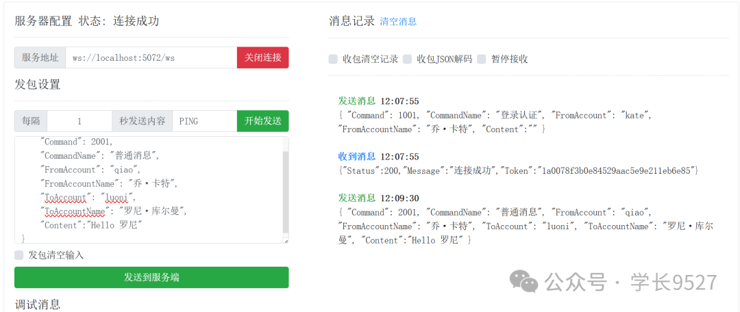 输入ws://localhost:5072/ws测试地址,点击开启连接,提示连接成功后可以开始测试
