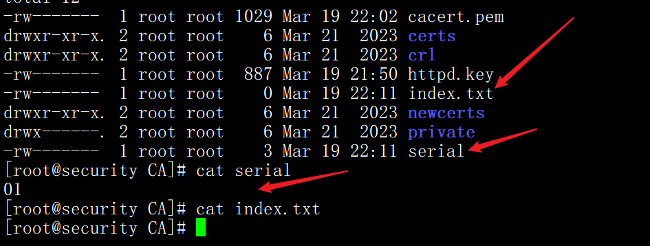3、执行如下命令生成根证书并且创建两个文件,分别是index.txt和serial,index.txt使用touch创建即可,serial中输入01。openssl req -new -x509 -key private/cakey.pem -out cacert.pem -days 3650