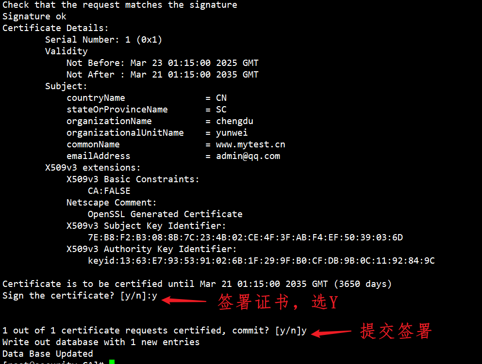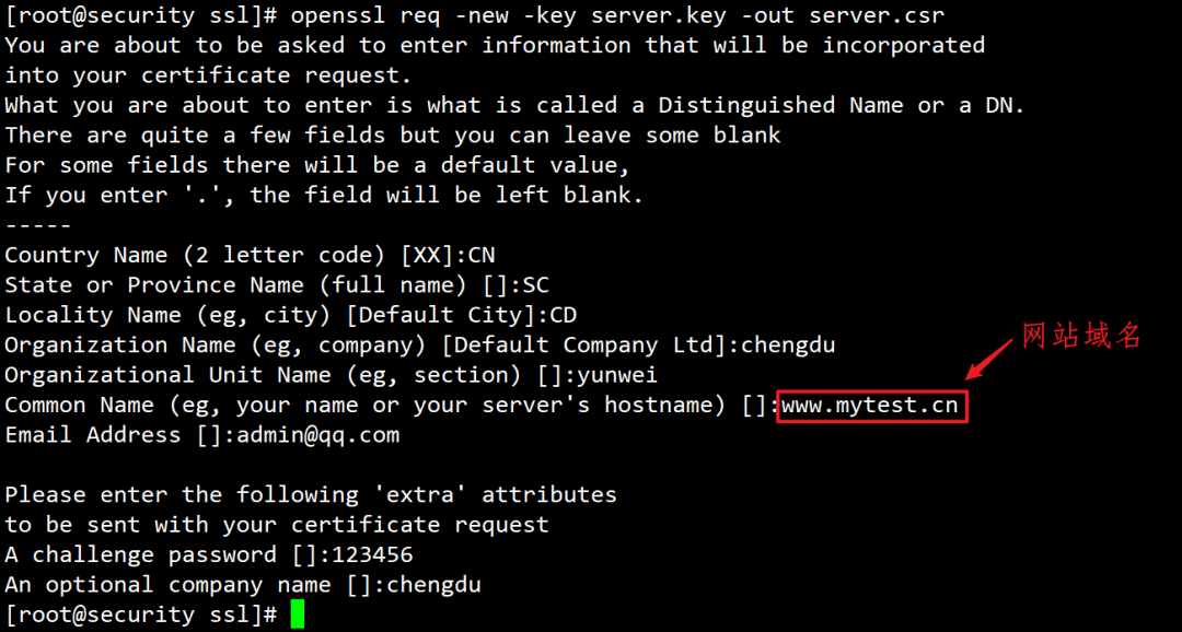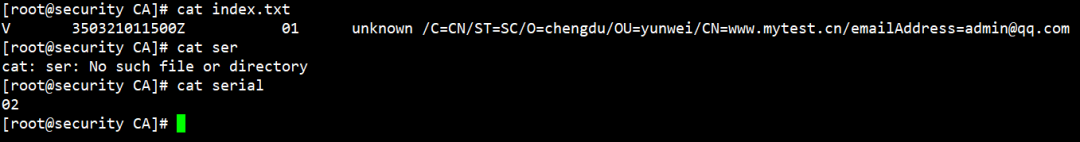 [root@security CA]# openssl req -new -x509 -key httpd.key -out cacert.pem -days 3650You are about to be asked to enter information that will be incorporatedinto your certificate request.What you are about to enter is what is called a Distinguished Name or a DN.There are quite a few fields but you can leave some blankFor some fields there will be a default value,If you enter '.', the field will be left blank.Country Name (2 letter code) [XX]:CN #国家State or Province Name (full name) []:SC #省份Locality Name (eg, city) [Default City]:CD #城市Organization Name (eg, company) [Default Company Ltd]:chengdu #单位名称Organizational Unit Name (eg, section) []:yunwei #部门名称Common Name (eg, your name or your server's hostname) []:www.ca.cn #填一个域名Email Address []:12345678@qq.com #邮箱