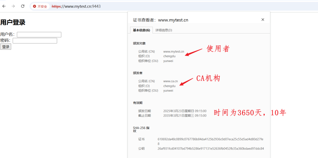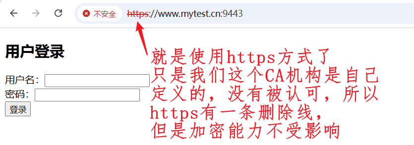 配置完成后使用nginx -s reload重新加载配置,让其生效,然后配置本地证书文件和hosts将第三步生成的CA服务器需要对外公开的证书文件cacert.pem复制到电脑本地,后缀名改为crt格式,然后双击安装证书,将其导入到电脑本地显示导入成功即可,由于www.mytest.cn这个域名没有在DNS域名服务商哪里注册,所以需要我们自己在hosts文件中添加域名解析地址,Windows电脑在C:\Windows\System32\drivers\etc下,先将hosts文件拖出来到桌面,然后修改添加如下内容在拖进去修改完成后就可以试着用https方式访问了,由于我使用了天翼云的ECS云主机,但是天翼云如果使用80或者443端口需要进行备案,所以我这里使用9443作为网页端口。这就是使用openssl工具自签发证书解决网页未使用https访问问题。