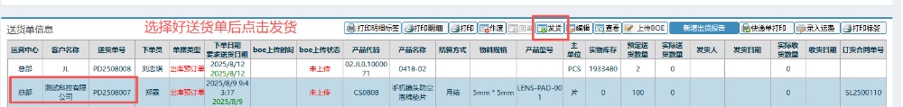 7.查询后,下方会显示所有的出库单,根据出库类型:出库预订单进行查找,点击对应送货单,点击发货。