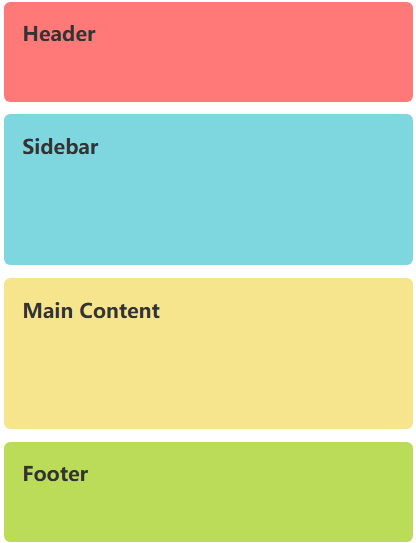 /* 响应式设计:当屏幕宽度小于768px时 */        @media (max-width768px) {            .container {                /* 改变网格模板:单列布局 */                grid-template-areas:                    "header"                    "sidebar"                    "main"                    "footer";                /* 将列定义改为单列 */                grid-template-columns1fr;                /* 行高可以自动调整 */                grid-template-rows80px auto auto 80px;            }        }    </style>    <div class="container">        <header class="header">Header</header>        <aside class="sidebar">Sidebar</aside>        <main class="main">Main Content</main>        <footer class="footer">Footer</footer>    </div>