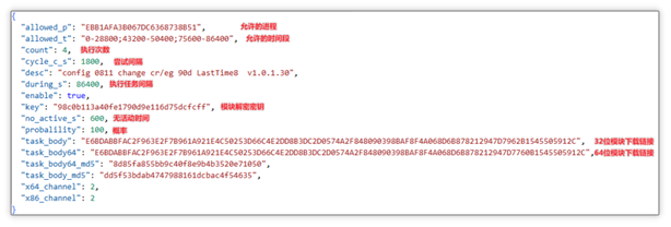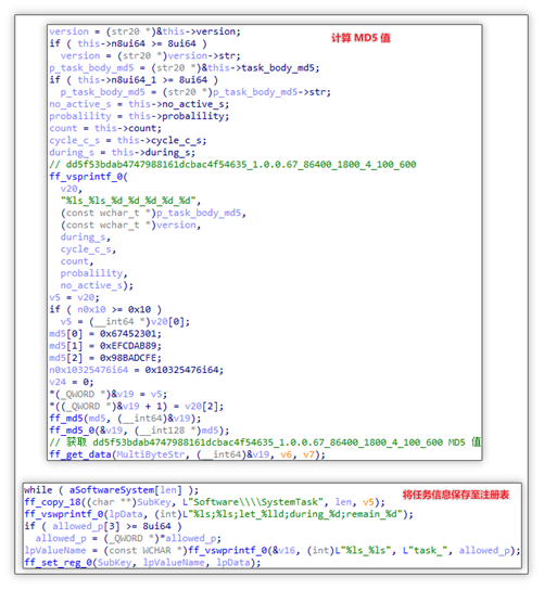 任务信息保存至注册表:首先会将云端配置中的七个关键参数以下划线的方式连接:task_body_md5、version、durings_s、cycle_c_s、count、probalility、no_active_s,对它们进行MD5 哈希计算,得出 MD5 值。随后再将 allowed_p、MD5 值、let_{当前时间}、during_{durings}、remain_{剩余任务执行次数}(该值每次任务执行时都减 1)通过分号连接,并将该字符串写入至注册表 HKEY_CURRENT_USER\SOFTWARE\SystemTask 项 task__{allowed_p} 键中。