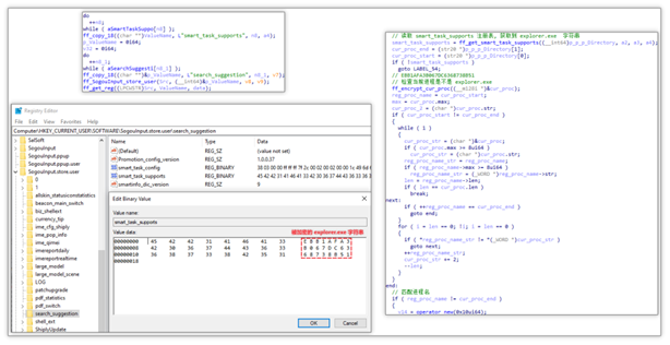 搜狗输入法将读取 search_suggestion 注册表中 smart_task_supports 的值,以获取支持的进程名列表,并与当前进程名进行比对。若匹配则会继续运行进程。