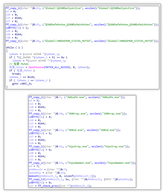 检测并规避杀毒软件:借助函数OpenMutexW 与 Process32NextW 检测本计算机中是否存在360或火绒的互斥体、进程名,若不存在则继续推广。