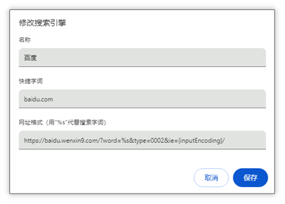 修改默认搜索引擎:通过写入 Preferences 与 Secure Preferences 配置文件的方式将 template_url_data 中 url 设置为 baidu.wenxin9.com/?{searchTerms}&type=0002&ie={inputEncoding}。之后用户再次搜索内容时先跳转到 baidu.wenxin9.com/?搜索内容&type=0002&ie=UTF-8,最终跳转至 www.baidu.com/s?tn=75144485_10_dg这类带有来源标识的链接并从中获利。