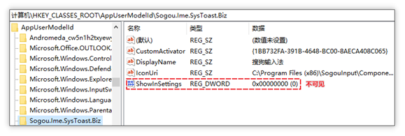 隐藏原理:通过设置搜狗输入法注册表 HKEY_CLASSES_ROOT\AppUserModelId\Sogou.Ime.SysToast.Biz 项中 ShowInSettings 键值为 0 的方式,达成按钮呈灰色不可点击且在通知设置中不显示的效果。