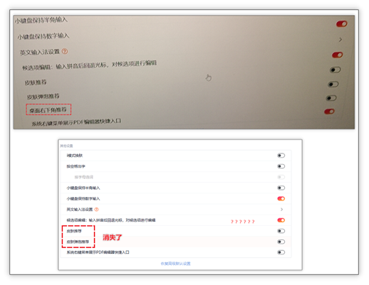搜狗输入法设置中取消勾选:用户发现通过搜狗输入法设置中取消勾选《桌面右下角推荐》选项,想以此操作来消灭弹窗。然而一部分用户又发现该《桌面右下角推荐》选项也消失了,但在分析过程中并未成功复现,估测该行为可能是通过云控下发时针对部分目标用户精准投放所导致。