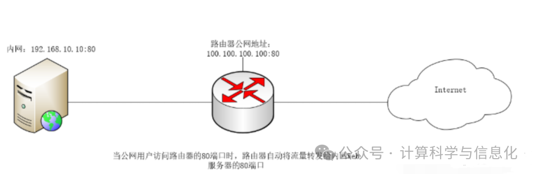 (比如10.x.x.x/172.16.x.x/192.168.x.x)外部网络无法直接访问内网中的服务器,可通过在路由器上做端口映射,配置内网服务器的IP地址与端口,如此一来外部网络便可以访问内网服务器,从而使用内网提供的服务了。