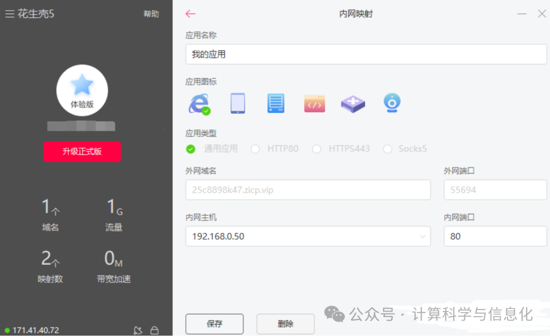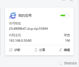 如果你的没有公网地址的话,也可以通过花生壳生成域名进行访问也行,下载花生壳,注册后然后会分配到一个二级域名,设置内外网端口,或内网主机。