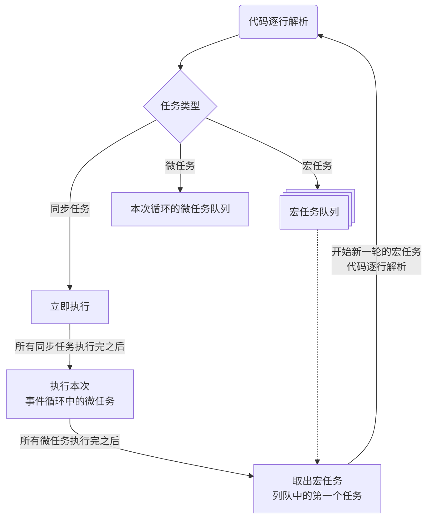 宏任务表示执行时间较长的任务,在每次时间循环时只会执行一个宏任务,执行完毕后处理微任务队列,所有微任务都执行完毕后进入下一个宏任务。