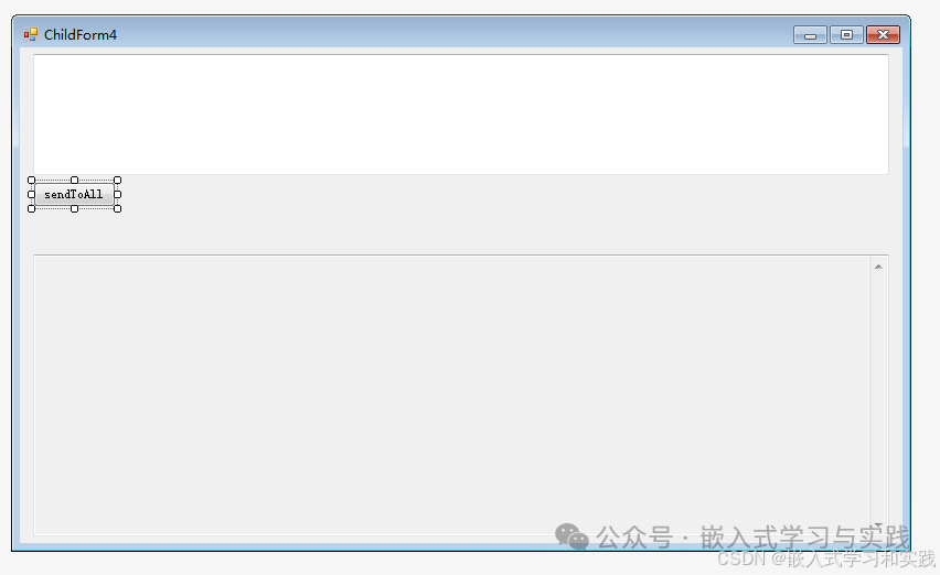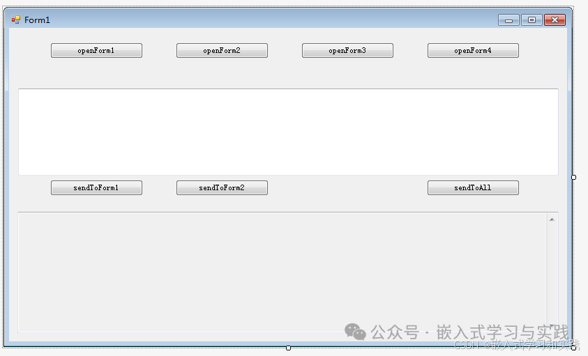 using System;using System.Collections.Generic;using System.ComponentModel;using System.Data;using System.Drawing;using System.Linq;using System.Text;using System.Threading.Tasks;using System.Windows.Forms;namespace MultiWindowCommunication.Forms{    public partial class ChildForm2 : Form    {        // 定义事件用于向主窗口发送消息        public event EventHandler<string> SendMessageToMain;        public ChildForm2()        {            InitializeComponent();        }        // 供主窗口调用的方法,接收主窗口消息        public void ReceiveMessage(string message)        {            txtReceived.Text = $"收到主窗口消息: {message}";        }        private void btnSendToMain_Click(object sender, EventArgs e)        {            if (!string.IsNullOrEmpty(txtMessage.Text))            {                // 触发事件,向主窗口发送消息                SendMessageToMain?.Invoke(this, txtMessage.Text);                txtMessage.Clear();            }        }    }}