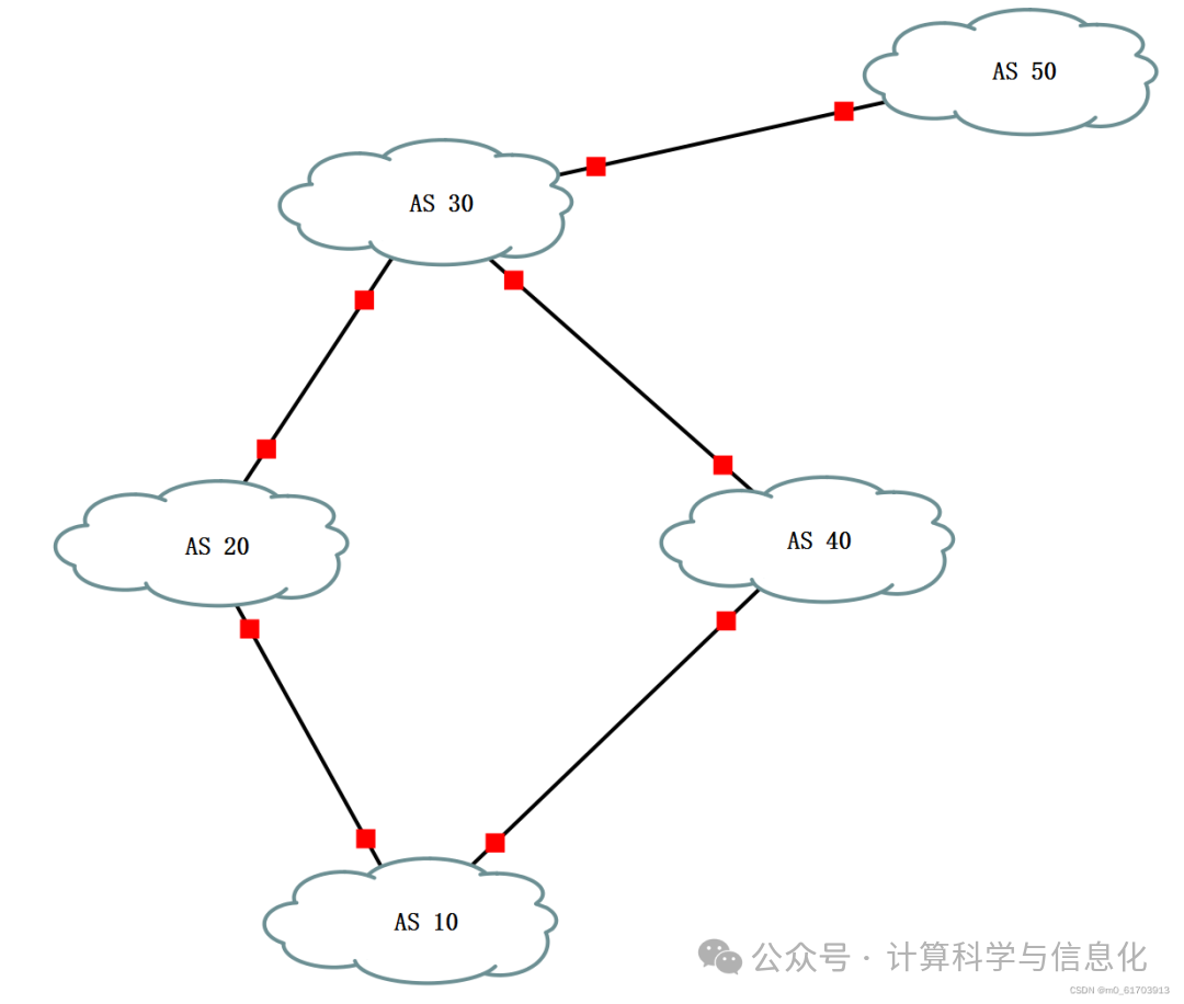当AS 10中的R4将网段10. 1.1.0/24通告给AS 20中的R1后,因为R1与R3之间是iBGP邻居,所以R1将路由10.1.1.0/24传递给R3,最终R3将路由10.1.1.0/24传递给AS30中的R5。