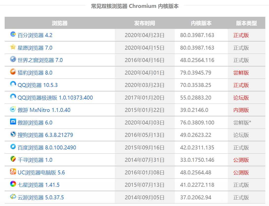 • 360安全浏览器(1.0-5.0为Trident,6.0为Trident+Webkit,7.0为Trident+Blink)