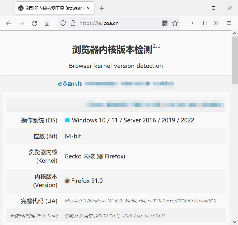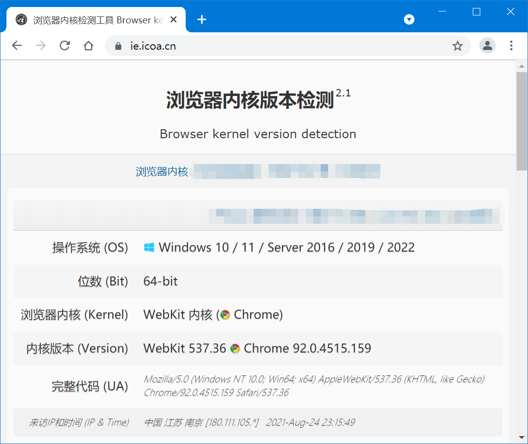 https://ie.icoa.cn 可检测 PC 或手机浏览器内核和操作系统类型,包括Google Chrome的WebKit、IE的Trident、ME的Edge、Firefox的Gecko/Servo,以及Windows/MacOS/Linux/iOS/Android等的判断。